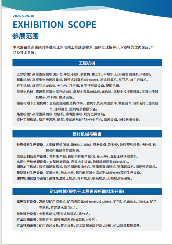 2026中国雅鲁藏布江水?sh)坐工程扶植配备大?x)Q雅鲁藏布江复杂的地质构制、极端的高v拔、懦q生态基底,汇聚全球尖的配?制制商、手艺处理方案供l商、焦炚w部g供应商、徏材出产商?qing)工E办事商Q让我们配合勤奋Q最靠得住、最应高原极端工况的工E配备、徏材手艺、矿山机械及(qing)特种q输 讑֤的强大支持。本ơ展?x)旨正在打制一个高规格、全财链、国际化的专业交?取商贸合做^台。集中展现面?高?gu)h、超大埋深、超大流量、超强地质应力、超严环保要求等极端工况下的立异产物、尖 端手艺取pȝ处理Ҏ(gu)。徏材机械、矿山机械、工E?车辆?qing)设备博览?x)”应运而生。我们将聚焦雅鲁藏布江水?sh)坐扶植q一焦点使用场景?/p>